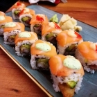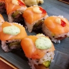 Letztere war ebenfalls in rohen Lachs gewickelt, hatte jedoch frittierte Garnele und Avocado in ihrem Reismantel versteckt. Allein der kleine Klecks Wasabimayo erhob dieses von frischester Ware kündende Lachsfigurenkabinett zu einer geradezu umwerfenden Lachs-Garnelen-Kombi, wie sie nur echte Könner ihres Faches hinbekommen.