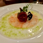 Ins eigentliche Menü starteten wir maritim: Plattierte Garnele (kein bißchen wässrig) hatte eine überraschende Süße, die durch etwas Zitrone, vermutlich aus dem Basilikumöl, gut abgepuffert wurde. Für geschmackliche Fülle sorgte Poverade, die auch zu einer Artischocken-Crème verarbeitet war. Frittierte Olivenscheiben knusperten fein und sorgten mit der getrockneten Minitomate für einen mediterrane Akzente. Das Jahr ist noch jung, aber das wird sicher eine der besten Vorspeisen außerhalb der Sterneküche bleiben.