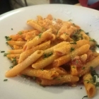 Ihre mit scharfer Tomatensauce durchmengten Röhrennudeln hatten gerade eine ordentliche Parmesanabreibung hinter sich, muteten aber im Gegensatz zu meiner Scharfbackware fast schon frugal an.