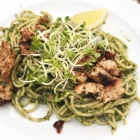 Die perfekt al dente gegarten Spagetti waren komplett mit der Soße umhüllt, nichts schwamm herum. Eine ordentliche Portion, sehr schmackhafte, dezent gebratene Lachswürfelchen waren darüber verteilt. Über dem ganzen noch eine Handvoll grüne Sprossen und ein Zitronenschnitz. Ein sehr empfehlenswertes Mittagsgericht.