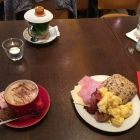 Morgens gibt es bis 12 Uhr nur das Frühstück. Danach werden kleine Gerichte und Burger angeboten, sowie Kaffee und Kuchen und Cocktails.