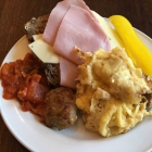 Frühstücksbuffet „All you can eat“ (12,95 – Mo bis Sa): Eine große Auswahl - Von frischen Brötchen und Croissants über Käse, Aufschnitt, Rührei, Bacon und vielen anderen Zutaten (Salate, Obst, Gemüse, Saft, Süßigkeiten). - Heißgetränke gehen extra!