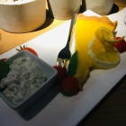 Zitronen-Tarte mit Joghurt-Minz-Sauce. Über die Sauce lege ich mal einen Mantel des Schweigens. Von der Konsistenz eher Quark als Joghurt fragte ich mich, was soll diese "Creme" bei der dieser wirklich gut gelungenen Tarte? Diese machte nämlich wirklich Freude, ein Mürbeteig garniert mit einer sauren, mit viel Zesten gewürzten Creme. Sehr lecker!