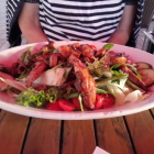Zum Essen hatten wir Bruschetta, für 6.50 € Vitello Tonnato für 11.50 €, Insalata Tonno für 8.50 € Pizza Mista für 10,50 € und Pizza Parma für 13.50 €. Die Pizzas waren sehr groß,gut belegt und sehr lecker. Die Wartezeit auf die Hauptspeisen war vieleicht einen Tick zu lang, was aber der vielen Gäste geschuldet war.Dafür wurden die Getränke und die Vorspeisen zügig serviert.
