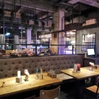 Aber der Reihe nach. Der Kollege hatte uns einen Tisch für vier Personen reserviert, was an diesem Abend aufgrund der geringen Auslastung gar nicht nötig gewesen wäre. Die hohen, unverputzten Decken und Wände, die blanken Betonpfeiler, die stylishen Retro-Hängelampen und die eingezogenen Gerüstbauteile ließen das stimmungsvoll ausgeleuchtete Innere des Purino in zeitgemäßer Industrieoptik erscheinen.