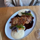 Der auf einer länglichen, flachen Schale servierte Spargelsalat mit weißem und grünem Spargel, Koch- und Seeluftschinken, Brotchips mit Pesto, angemacht mit einer erfrischenden Vinaigrette gefiel meiner ständigen Begleiterin zurecht sehr gut.
