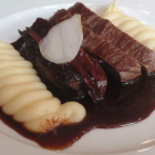 Für meinen Mann geht es beim Hauptgang im Menü weiter mit Odenwälder Wildschwein. Mutmaßlich sous vide gegart ist es sehr zart und deftig eingefasst von einem Ragout aus den Bäckchen, dem Speck noch einen zusätzlich kräftigen Schub mitgibt.