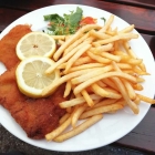 Meine Schnitzel waren fair angekündigt. Fanden sie sich doch unter der Rubrik „Frittiertes“ ein. Wählen konnte man als Beilage Kartoffelsalat oder Pommes.
