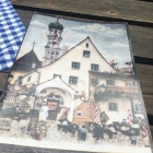 Es gibt hier eine bedruckte Karte aus Karton mit einen bayrischen Bild vorne drauf. Es gibt hier Suppen, Brotzeiten, Hauptgerichte sehr Fleischlastig, Salate und was für die Zwergerl. Auch Nachspeisen sind vorhanden.