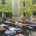 Die Wände sind alle schön grün bewachsen und es befinden sich große Bäume im Biergarten.