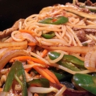 Bei meiner Nudelpfanne wurde auch nicht am Gemüse gespart. Frische Zwiebeln, Karotten und Sojasprossen tummelten sich neben Rindfleischstreifen, die auch ohne Weichmacher bestens auskamen. Nur gut, dass die inflationär verwendeten Peperoni-Stücke vom Schärfegrad her eher im unteren Scoville-Bereich angesiedelt waren. Vor dem auftretenden Rachenfeuer hatte mich nämlich schon die „Goreng-Göre“ beim Bestellvorgang gewarnt. Woraufhin ich um etwas mildere Würzung bat.
