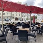 Es gibt vorm Haus zwischen Straße und Gehweg einen Außenbereich. Dieser ist mit roten Schirmen beschattet die auch ein paar Tröpfchen Regen abhalten können.