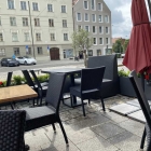 Es gibt hellbraune Tische und dazu Art Rattanstühle in schwarz mit Lehne.