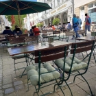 Man sitzt hier an der Straße beim Außenbereich. Autos fahren hier zu Essenszeiten nicht, glauben nur bis 10 Uhr erlaubt. Fußgänger und Radlfahrer muss man halt akzeptieren. Es gibt hier die typische Brauerei Biergartenbestuhlung mit den Klapptischen und Stühlen in braun. Auf den Stühlen liegen überall grüne Sitzkissen aus, das gefällt uns. Beschattet wird hier durch große Schirme.