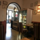 Drinnen sieht man die Theke und eine Vitrine mit Speisen. Im ersten Raum befinden sich aber auch schon einige Tische. Wenn man weiter geht, kommt man in eine zweite Abteilung.