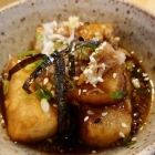 Inzwischen kam mein Sojaprotein-Snack. Guter Seidentofu in Tempurateig frisch ausgebacken. Leider danach mit der Sojasauce übergossen, so dass die Panade schnell weich und zäh wurde. Frisch geraspelter Ingwer sorgte für einen kleinen Kick.