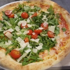 1 „Pizza Rucola“ mit frischen Tomaten, Mozzarella, Rucola und geraspeltem Parmesan für 9,00 €