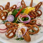 Spundekäs mit kleinen Brezeln, Salatgarnitur und roter Zwiebel