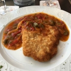 Der Teller kam, und ich konnte die zunehmende Enttäuschung meiner Frau mit ansehen beim Anblick ihres Gerichts. Die Sauce war viel zu schwer für Fisch, sehr dick abgebunden, viel Sahne, kein Wein schmeckbar, der Fisch durchgegart........puh! Setzen, sechs! Schlecht! Ich würde diesen Abend noch was unternehmen müssen, um die Laune meiner Frau wieder anzuheben. Ich hatte mir schon gedacht, dass die Küche nicht überfordert werden darf mit anspruchsvollen Gästewünschen und etwas bestellt, was man nur grob fahrlässig oder vorsätzlich verhunzen kann, nämlich ein Schnitzel (ohne die Erwartung einer frisch geklopften Stückes Fleisch).