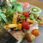Es folgte ein ansehnlich bestückter Salatteller, dessen kurz angebratene Pfifferlinge eine tolle Qualität hatten. Auch das leicht von der Haut lösbare Forellenfilet aus dem Pfälzerwald überzeugte mit seinem saftig-rauchigen Fleisch. Zu dem Salat mit hochwertigem Zuchtfisch aus der Region gesellten sich noch Cocktailtomaten in verschiedenen Rottönen, Frühlingszwiebeln, Knuspercroutons, leicht angeröstete Sonnenblumenkerne und etwas „Radieschenklein“.