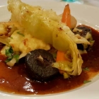 Die Mittelmeer-Suppe schlechthin hinterließ gemischte Gefühle: Die Brühe schmeckte nicht nach Fischfonds, sondern sehr stark nach Krustentier. Eine Anisnote fehlte leider. Die Einlage mit Licht und Schatten und von der Auswahl etwas irritierend:
