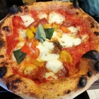 Ich hatte mich mal wieder für die pikante Pizzavariante entschieden. Natürlich kam sie in der klassischen Vesuv-Version aus dem Kuppelofen. Das heißt als wulstig aufgeblähtes, teilweise etwas verkohltes Randkissen, in dessen Innerem ein fruchtig-scharfer Belag den fluffig-dünnen Boden überdeckte.