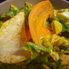 Für Knack sorgten Streifen von Zuckerschoten. Oder sollten es jedenfalls, doch wenn sie zu lange gegart werden, machen auch die süßen Schoten schlapp. Schade, der einzige handwerkliche Fehler. Ansonsten: Naja. Die helle Sauce nicht misslungen, wieder recht vorsichtig gesalzen. Frühlingsgemüse - Erbsen, Karotten, Kohlrabi - im November immer so ein Punkt. Und wie fest oder weich Gemüse sein darf, ist ja sowieso Geschmacksache.
