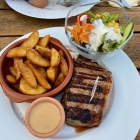 Das Steak ist medium gebraten, wie bestellt. Es ist saftig und zart mit einem ausgeprägten Fettrand. Nichts zu meckern, ein anständiges Stück Fleisch.