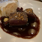 Ein Dessert gab es auch, dazu einen Espresso. Eingelegte Brombeeren im Lavendelsirup, weißes Schokoladen-Lavendel-Mousse, Whisky-Karamell, Whisky-Perlen, Brombeergel, Brombeer-Malz-Crumble.