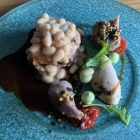 Es folgte Iberico Karee & Wurst | Bohne & Tomate als letzter Hauptgang mit dem Hauptdarsteller des Abends, dem Iberico Schwein. Danach ging es in den süßen Abschluss.