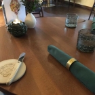 Wir wurden von Frau Morel und ihrer Mutter in Empfang genommen und die Garderobe wurde uns abgenommen und wir an den für uns vorgesehenen Tisch platziert. Ein Blick durch den Raum verriet eine sehr zurückhaltende Raumdekoration, die Tische und Stühle sind recht einfach gehalten. Auf Tischdecken wird verzichtet. Auch die Tischdekoration ist recht sparsam, man bekommt den Eindruck, dass alle Aufmerksamkeit auf das Geschehen in der Küche gelenkt werden soll. Es war ja der Vorabend meines Geburtstages, deswegen als Antwort auf die Frage nach einem Aperitif ein Champagner für meine Frau und einen Wermut für mich.