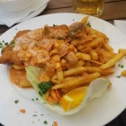 Mein Balkanschnitzel „Wiener Art“ war schon beim Anblick enttäuschend. Hatte ich mir doch ein „Zigeunerschnitzel“ – was ja heute nicht mehr so heißen darf- vorgestellt, kam hier ein Schnitzel mit einer undefinierbaren braunen Pappe obenauf mit Pommes die schon augenscheinlich viel zu lange in der Fritteuse waren. Geschmacklich war es nicht anders als erwartet. Die Pommes viel zu kross, die Soße mit Balkanart nicht viel gemein und das Schnitzel in der Fritteuse totgebraten. Na danke.