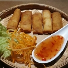 Was auch keinen guten Eindruck macht, ist das Geschmiere in der Speisekarte. Mit einem Textmarker wurden ganze Passagen geschwärzt. Man kommt sich fast vor, als ob man einen Geheimbericht des FBI liest. Kostet das Drucken neuer Karten so viel? Am Speiseangebot habe ich jedoch nichts auszusetzen, wobei ich die Sushi-Seiten ignoriert habe. Bitte zweimal eine große Rhabarberschorle (0,5 l € 4,50), zur Vorspeise: Tom Chien Xu 3 panierte Garnelen, serviert mit süß scharfer Soße (€ 6,90) und Cha Gio Chay 5 vegetarische Mini Frühlingsrollen (€ 4,20). Hauptspeise: Rau Xao Teriyakisauce gebratenes Gemüse nach Saison mit hausgemachter Teriyakisoße und gegrilltem Lachs (€ 15,90) und Sot Xoai serviert mit Reis, verschiedenen Gemüse nach Saison und Ente kross mit Mango-Kokos-Soße (€ 14,90).