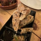 JERK CHICKEN VOM LAVASTEINGRILL -9,90€ Hähnchenkeule ohne Knochen in würziger Marinade. Eines der ganz wenigen Gerichte, die nicht so gut ankamen. Der Freund zu meiner Linken fand es zu hart geröstet, daher trocken und über würzt. Zu diesen und weiteren nicht fotografierten kleinen Tapas-Gerichten der festen Karte, einsehbar auf der HP gesellten sich noch Gerichte aus zwei Seiten Tages/ Saison Karte, die etwas größer waren in ihrem Umfang.