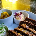 Zur Verabschiedung gab es noch eine kleine Petit-fours-Auswahl mit einem Canelé mit Passionsfruchtschaum und Himbeere, einem Vanille-Eis auf Streuseln und einem kleinen Brownie, die wir uns durchgehend gerne schmecken ließen.