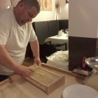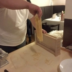 Nach unserer Bestellung wurde der Koch im vorderen Bereich an einem Tisch aktiv: Unsere zwei Portionen Spaghetti wurden hergestellt, und ich durfte fotografieren. Der Koch agierte (trotz seines Umfangs) schnell und routiniert: Nudelkugel in der kleinen Maschine plattiert, mit der Nudelrolle in die passende Form für das Brett gebracht, draufgelegt, durch die Rillen gedrückt, von unteren Brett herausgeholt, fertig und ab zum Kochen, was mit frischer Pasta natürlich deutlich schneller geht. Nachträgliche Ergänzung: Durch den Kommentar vom Borgfelder weiß ich jetzt, dass dieses Brett "Pasta Chitarra" heißt,