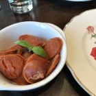 Das Tagesgericht, eine Hähnchenkeule aus dem Ofen mit schön eingeöltem mediterranen (!) Gemüse und lauwarmen, mit hausgemachter Mayonnaise angemachten Kartoffeln (12,40 €), soll es auch in Chile geben, dort aber in einer etwas pikanteren Version, die man dem Herrenalber Publikum so besser nicht vorsetzt. Das muss das ernüchternde Feedback in der ersten Zeit nach der Eröffnung gewesen sein. Uns wurde leider erst hinterher von der Chefin versichert, dass man bei der Bestellung anmelden kann, dass man keine Schonkost möchte. Denn auch die Tapas waren, ich muss es leider so sagen, ein wenig langweilig. (Dass fremdländische Gerichte ihrer Charakteristika beraubt werden, ist uns in Bad Herrenalb nicht zum ersten Mal begegnet, wie man in meinem Bericht zum Café Schubert nachlesen kann.)