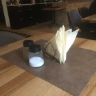 Im vorderen Bereich haben die Tische eine helle Holzplatte, Stühle sind die gleichen. Auf dem Tisch gibt es eine Art Lederdeckchen auf der sich ein Salz-und Pfefferstreuer befindet und ein Ständer mit zusätzlichen Servietten. Das Besteck bekommt man in einer Serviette gerollt gereicht.