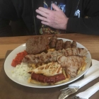 Bei der Grillplatte war ordentlich was drauf. Hier das Ajvar und die Zwiebeln das gleiche wie beim anderen Gericht. Im Untergrund befand sich eine ordentlich Ladung Reis und Pommes. Beim Reis finden wir das nicht so schlimm, die Pommes darunter weniger. Die währen uns extra lieber denn sie weichen immer sehr schnell auf. Sie kamen aber knusprig an, waren nicht fettig und innen schön weich. An Salz fehlte es ihnen auch nicht. Der Reis war auf den Punkt gegart mit einem schönen tomatigen Geschmack und mit Gelberüben, Mais und Erbsen verfeinert. Diese hatten einen klasse Geschmack und waren nicht so matschig als ob sie aus der Dose kamen. Der Reis war lecker. Dann mal ran an die Fleischberge und schauen wie man es hier auf dem Teller schneiden soll. Etwas hin und her schieben und es konnte los gehen. Gut es wurde etwas auf dem anderen Teller zwischen gelagert, durfte ja auch mitessen – äh – helfen. Die vier Cevapcici waren die gleichen. Beim Hacksteak hat man noch mit etwas Paprika und einen Tick schärfe nachgeholfen. Wir denken dass auch noch Kräuter beim Geschmack mit halfen. Der Kalbsspieß , das Schweinesteak und das Stück Hühnchen waren sehr zart und saftig gebraten worden. Vom würzen her gab es nichts zu meckern und grob gemahlener Pfeffer brachte noch etwas Pfiff mit rein. Das Stückchen Wurst war super klasse im Geschmack. Leicht rauchig mit einer Paprikanote und schönen schärfe.