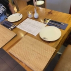 Auf dem Tisch gibt es einen kleinen Teller, daneben eine blaue Serviette auf der sich ein Halter befand zum ablegen vom Löffel und den Stäbchen. Ein Glas mit elektrischen Licht und eine Vase mit trocken Blumen stehen auch noch auf dem Tisch.