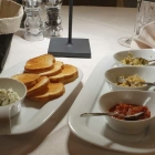 Wunderbar, weil eher selten in der heimischen Gastro-Szene, es gibt einen Berlucchi 61 aus dem Franciacorta in der Lombardei (€ 46,--). Dafür schubse ich jeden Valdo zur Seite !!! Er wird auch perfekt gekühlt serviert, das Glas beschlägt beim Einschenken, das macht Freude :-)) Genauso wie die in hübschen Schälchen gereichten Brotaufstriche: mit Frischkäse und Kräutern (geschmacklich meilenweit entfernt vom drögen Gastro-Quark), Tomatensugo, grüne Olivencreme und Artischocken/Sardellen. Dazu geröstete Bruschettascheiben und ein ganzer Korb voll äußerst schmackhaftem Weißbrot.