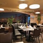 Ein überdimensioniertes Wandbild von der Rialtobrücke (Venedig) lasse ich mir ja noch gefallen. Aber ob eine Fototapete in Maueroptik das Interieur behaglicher macht, muss jeder für sich selbst entscheiden. Zumal das Mobiliar eher funktional-bistronomischen Charakter hatte und dadurch die Gemütlichkeit schon rein optisch massiv eingeschränkt wurde. Auch die zu helle Beleuchtung ließ jegliche Assoziationen zu einem rot-weiß-karierten Pizza-und-Pasta-Idyll im „Bahnhofslicht“ ersticken.