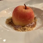 Als Bratapfel 2.0 annonciert kommt das erste Dessert an den Tisch. Als Trompe-l’œil ist eine Schokoladenhülle dem Apfel sehr identisch nachgebildet. Darin befindet sich Glühweinschaum, Kardamomeis und Bratapfelkompott. Das ist handwerklich und optisch wirklich gut umgesetzt und auch geschmacklich sehr gelungen.