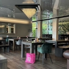 Von der Straße aus geht es eine breite Treppe herunter, man erreicht die Brasserie aber auch ebenerdig (siehe ganz unten). Eine junge Dame, die, wie wir später erfuhren, noch relativ neu war, empfing uns am Eingang zum Gastraum. Wir hatten nicht reserviert, Platz nach Wahl war trotzdem, auch für Calvin. Wir suchten nicht lange rum und setzten uns an einen Zweiertisch am Fenster, gleich hinter dem Eingang.