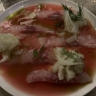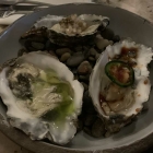 Crudo of the night nannte es sich und wurde in der Karte mit "catch of the day mit Fenchel und Fermente-Vinaigrette" beschrieben. Keine Ahnung was das bedeuten sollte, jedenfalls war es eine Art Cevice mit fruchtigen Aromen in der Vinaigrette. Und wenn es ich richtig erinnere, war der Fisch ein Streifenbarsch nach Auskunft unseres nervösen Servicemannes. Da fehlten meine Austern noch, und als diese serviert wurden, fragte ich mal etwas deutlicher nach den vor 20 Minuten notierten Wünschen gewisser Gäste an unserem Tisch.