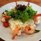 Gebratene Riesengarnelen, Spargelrisotto, Parmesan, Wildkräuter - € 18,00.