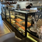 Drinnen lässt es sich genauso angenehm sitzen wie im Sommer draußen auf der Terrasse. Im Laden waren zwei Herren, einer kümmerte sich freundlich zugewandt um den Service, ein weiterer Herr hinter der Theke war mit dem zubereiten der Speisen beschäftigt. Den Holzkohlegrill hatte er schon auf Temperatur gebracht.
