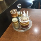und es gibt an manchen Tischen Ständer mit Würzmöglichkeiten – Sojasoße, Sambal Olek, Salz-und Pfefferstreuer und – es gibt sie noch die eingepackten Zahnstocher.