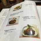 Es gibt hier eine dunkelbraune Ledereinbandkarte mit Klarsichthüllen. Gerichte wie bei so vielen Asiaten. Zum Teil ändert sich bei manchen Gerichten nur die Fleischsorte. Zum Teil sind auch bei den Gerichten Bilder mit vertreten. Die Gerichte sind auch auf englisch beschrieben. Unter der Woche gibt es Mittagsangebote mit einer Suppe mit dabei. Preise hat man zum Teil mit Kulli ausgebessert und vermutlich erhöht und zum Teil mit Aufklebern.