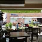 Hier ist es etwas schmaler gehalten. Rechts und links gibt es Tische und gerade hinter einen Tresen und die Getränkekühlschränke. Oben drüber gibt es auch die Tafeln mit Speisenangeboten. Das erinnert an einen Imbiss , der Rest eher nicht.
